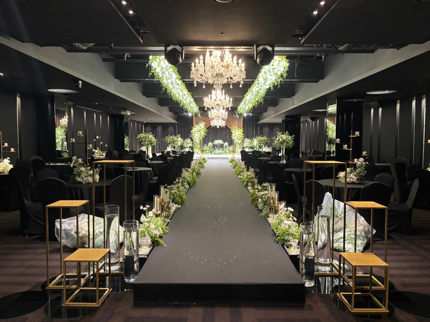 2. 취향 저격하는 디자인 (샹들리에, 버진로드를 따라 위/아래 꽃장식, 정면에 보이는 아치장식과 주변 컬러의 조화)