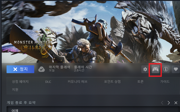 Steam의 라이브러리 목록에 있는 'Monster Hunter Wilds'를 우클릭 후 속성 클릭. 컨트롤러 탭에서 오른쪽 상단의 'Steam Input 사용'으로 설정한다.