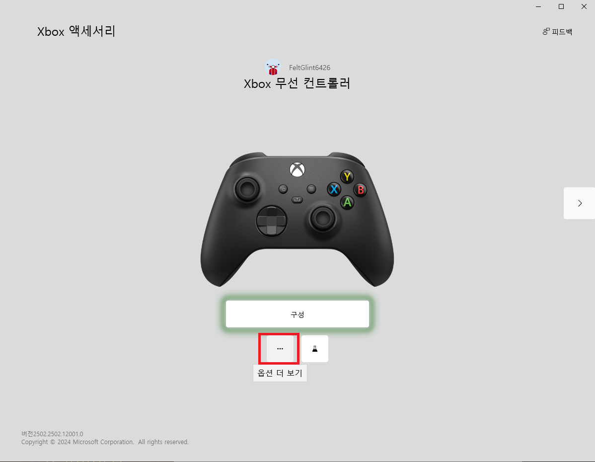 내 패드가 뜨면 아래의 점 세 개를 눌러서 옵션 더 보기로 들어간다. 만약 내 패드가 안 뜨면 Xbox 앱에서 로그인이 안되어 있는 것이므로 Xbox 앱에 들어가서 로그인해 준다. 업데이트할 내역이 있다면 업데이트해 준다.