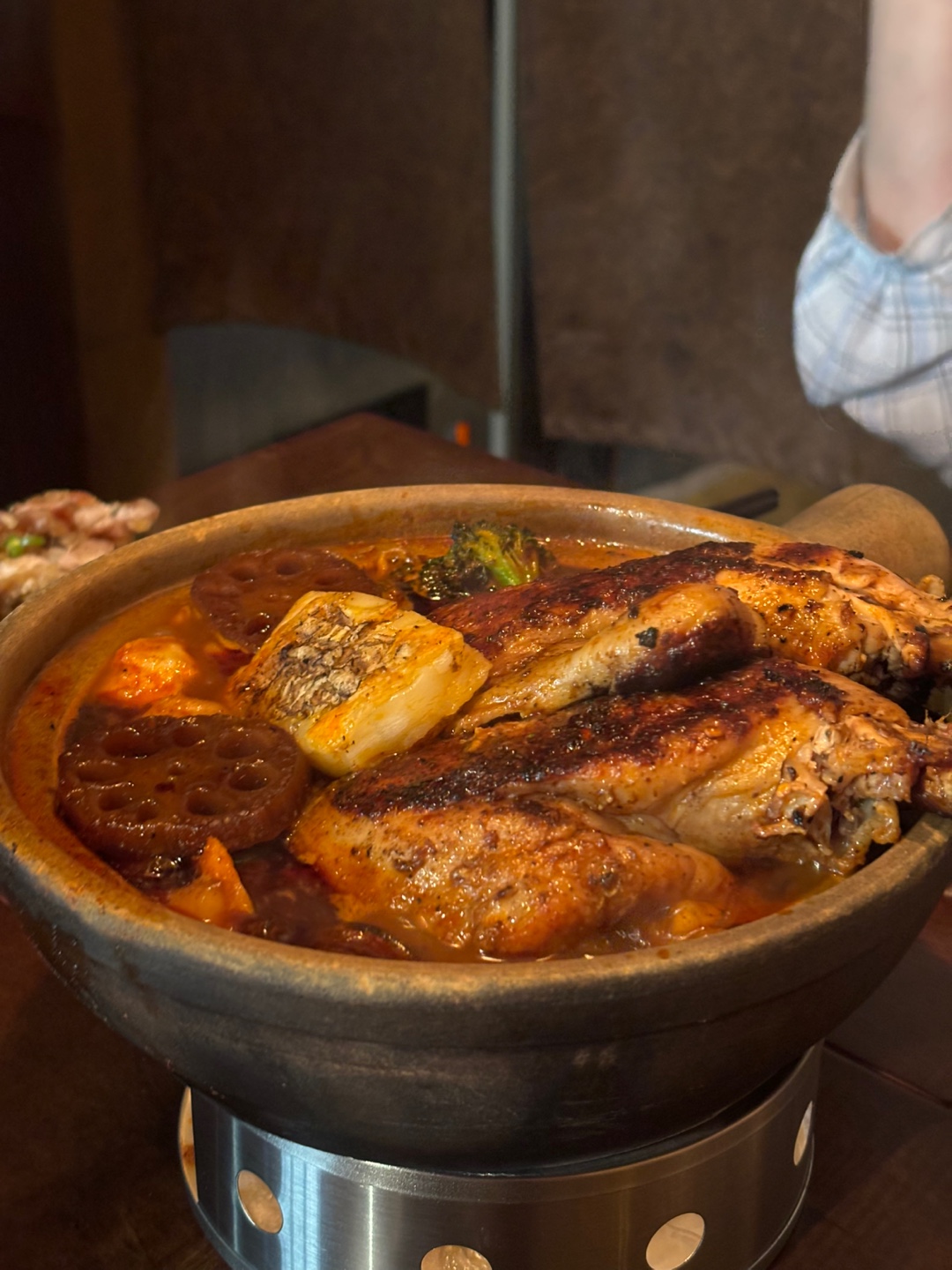 우리는 직화마라탕 닭고기에 넙적분모자 추가하고, 곁들임으로 고추바삭유림기 추가, 레몬꼬량볼 무알콜로 주문! 음식은 생각보다 진짜 금방 나왔고, 끓어서 나오는데 비주얼 미쳤음!