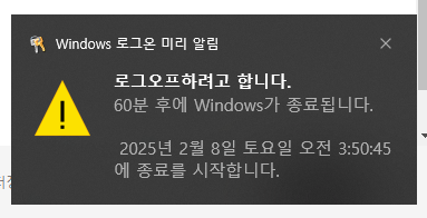 4. 만들어진 바로가기를 더블클릭하면, 설정한 대로 1시간 후에 컴퓨터 자동 종료가 예약된다.