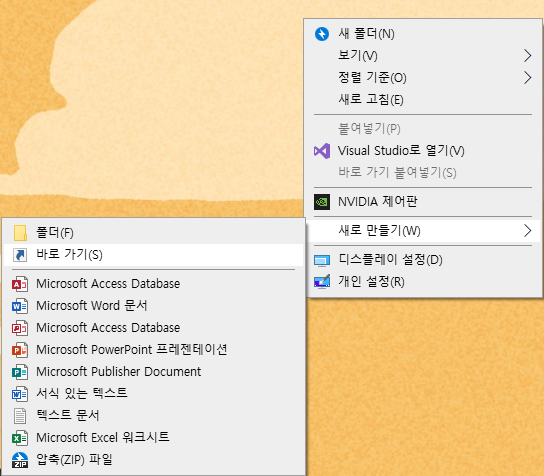 1, 바탕화면에서 우클릭 - 새로 만들기(W) - 바로가기(S)